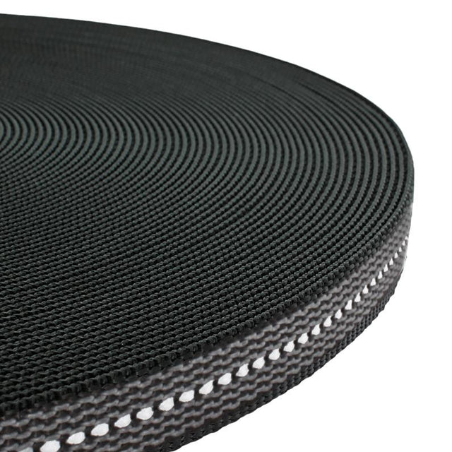 Verbessern Sie die Sichtbarkeit Ihres Hundes bei Spaziergängen im Dunkeln mit unserem Anti-Rutsch Gurtband. Aus stabilem Polypropylen gefertigt, bietet es dank der reflektierenden Streifen und des rutschfesten Gummis bessere Sicherheit und Halt. Perfekt für die Herstellung von Halsbändern, Leinen und Geschirren. Erhältlich als Meterware oder in 50 m Rollen mit maximal 4 Verbindungen pro Packung.